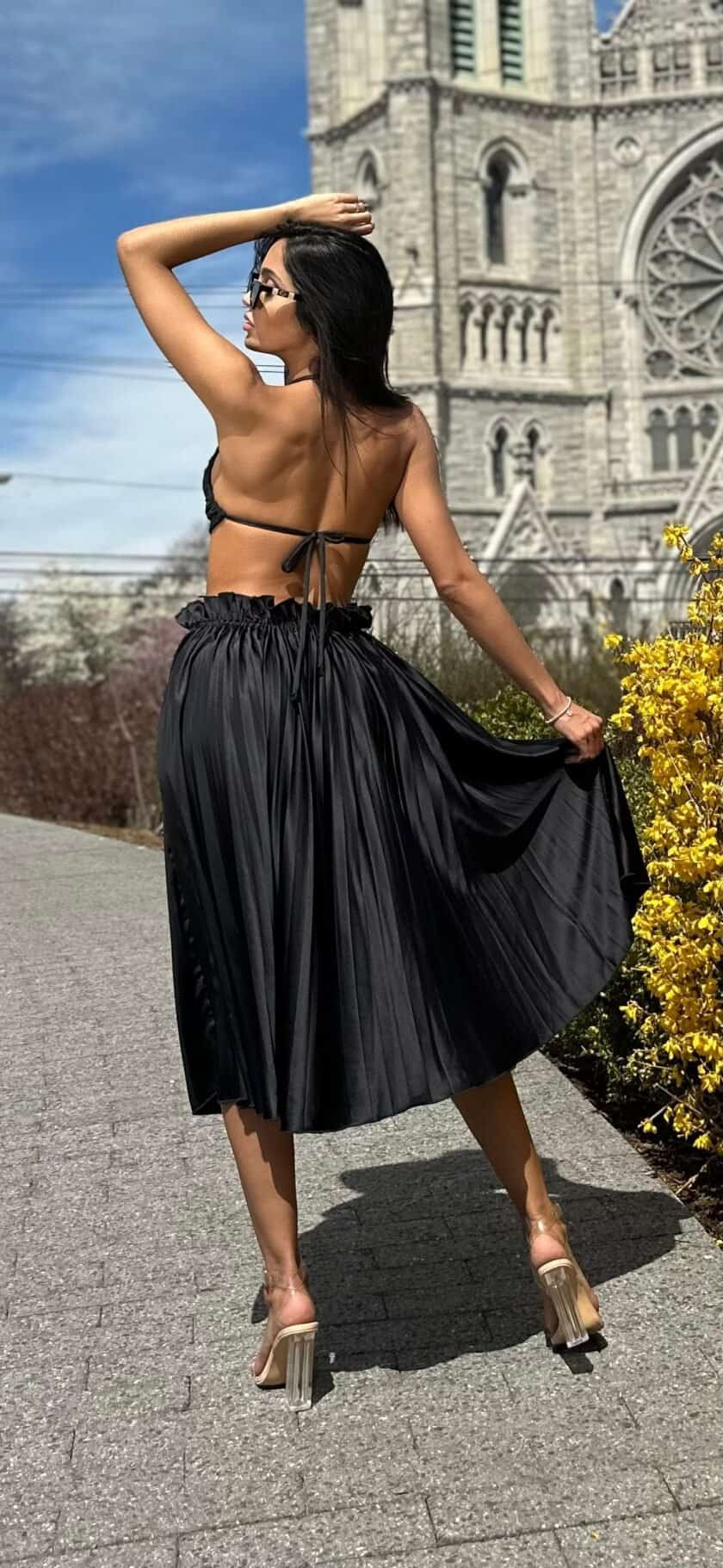 • Crafted with Satin fabric, this pleated midi skirt adds instant elegance to any wardrobe. Its A-line silhouette and high-rise waist create a flattering and sophisticated look, making it a versatile choice for any occasion.