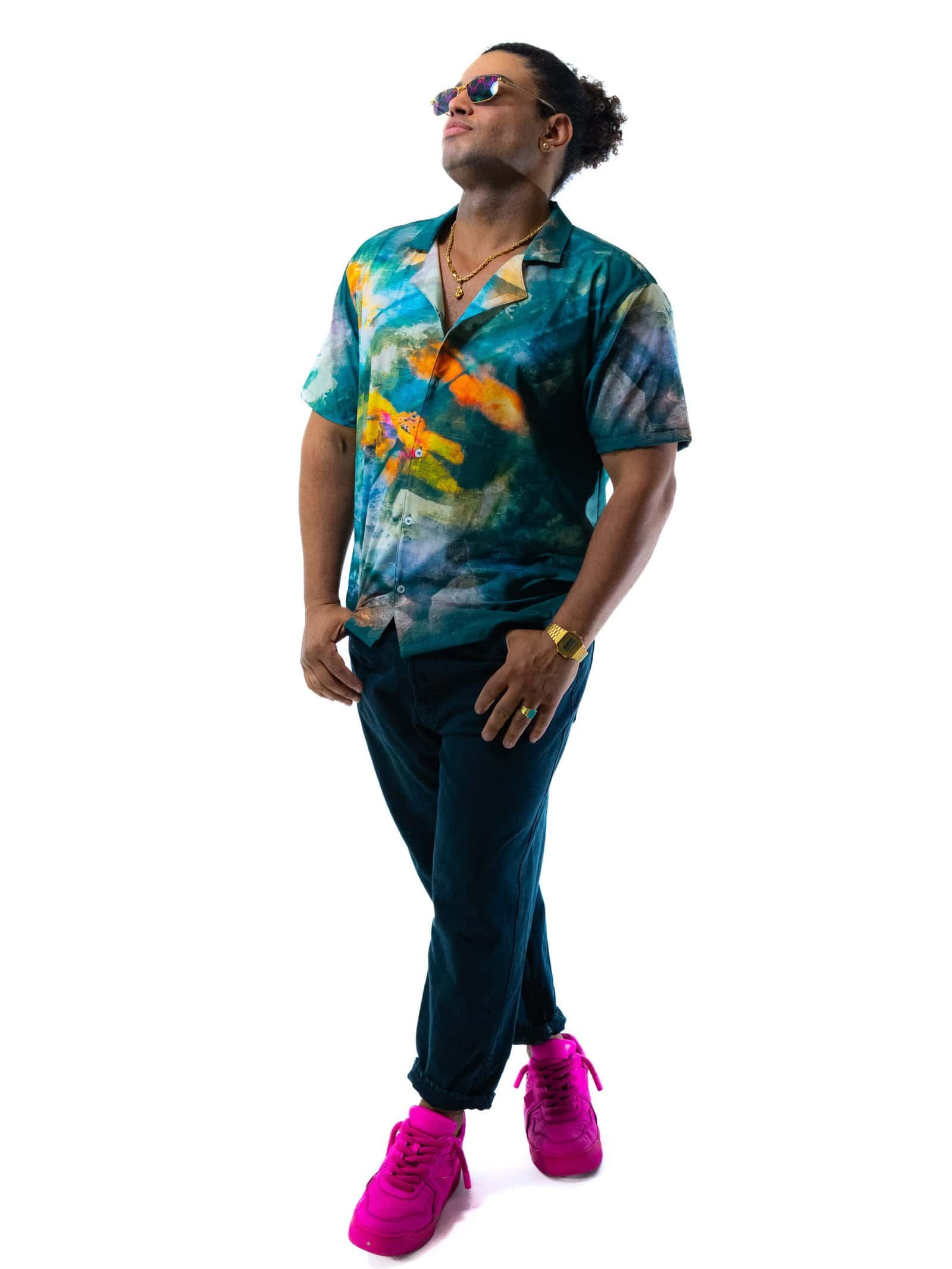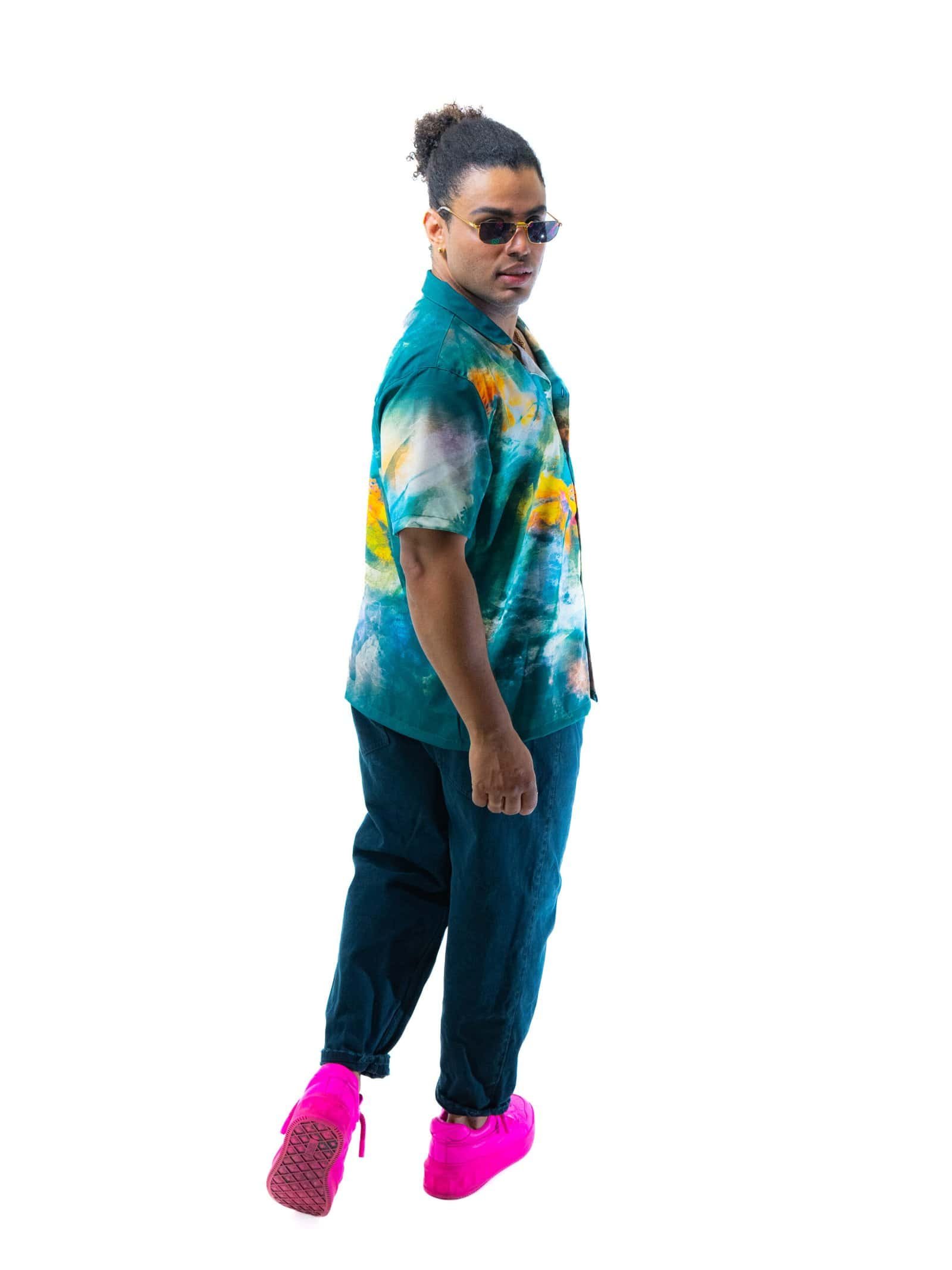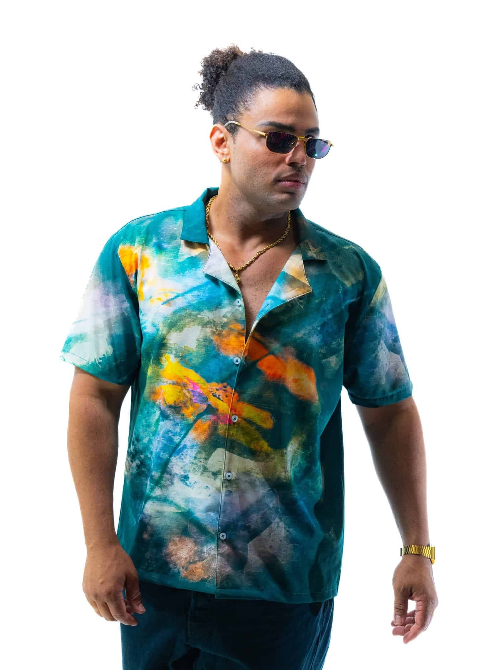 The flowing teal tones symbolize calm and sophistication, while the bursts of orange add a pop of enthusiasm and energy. Together, these colors create a one-of-a-kind design that resonates with individuality. Pair it with dark jeans for a casual style or tuck it into tailored trousers for a more formal look; whichever way you choose to wear it, this shirt will stand out as a versatile yet bold wardrobe essential.